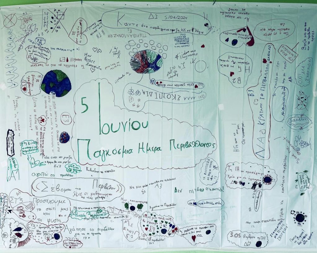 Τιμώντας την 5η Ιουνίου ως παγκόσμια ημέρα περιβάλλοντος, το σχολείο μας δημιούργησε ένα πανό γεμάτο ευχές και ιδέες για έναν κόσμο γεμάτο σεβασμό προς οτιδήποτε μας περιβάλλει.
