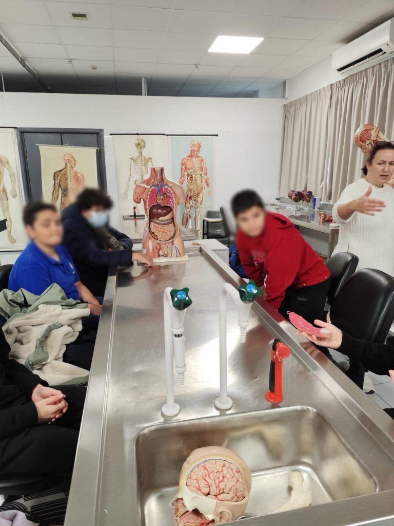 Τελευταία στάση τους ήταν το εκπαιδευτικό ανατομειο της Σχολής όπου τους έγινε παρουσίαση των οργάνων και συστημάτων του ανθρώπινου σώματος με τη χρήση ανθρωπινων προπλασματων, τα οποία έπιασαν και μελέτησαν από κοντα.