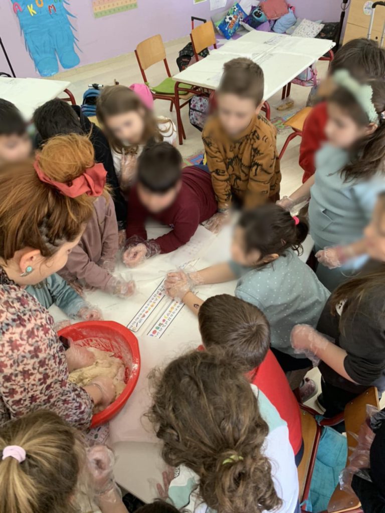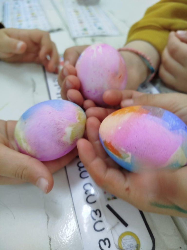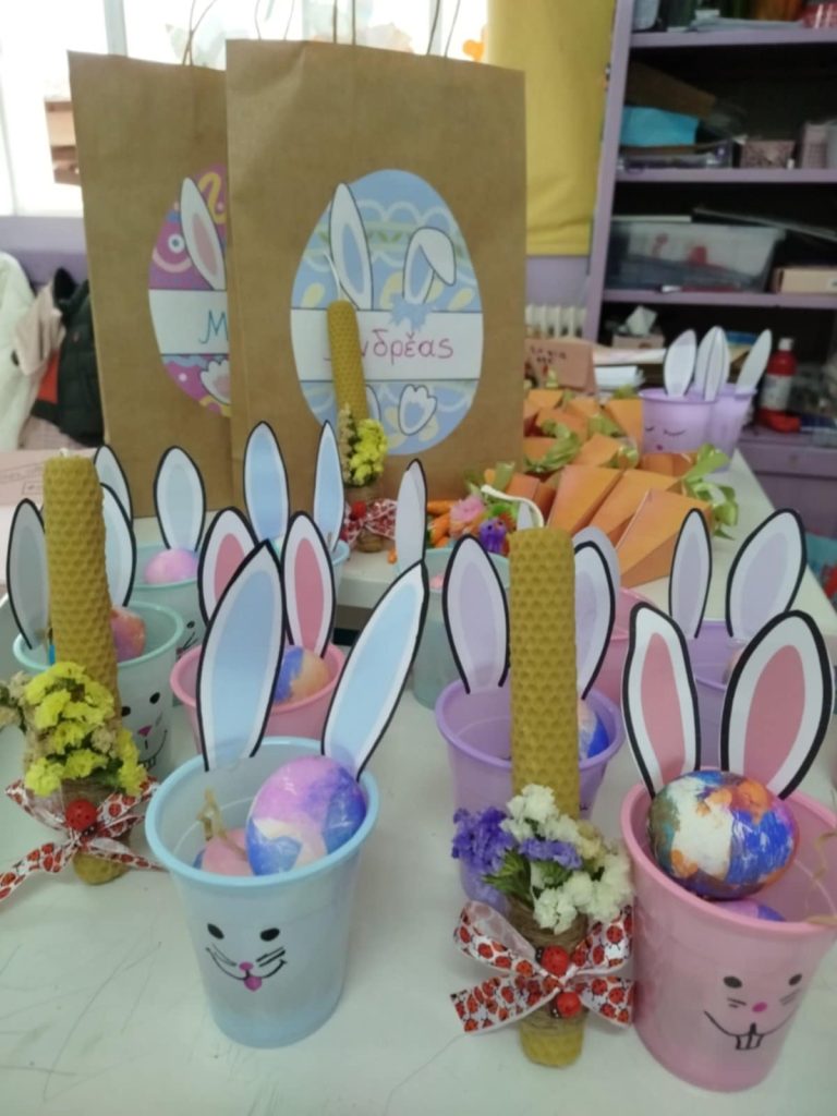 Επιπλέον, έβαψαν τα πασχαλινά τους αβγά με την αξιοποίηση γκοφρέ χαρτί, σκόρπισαν μυρωδιές φουρνίσματος φτιάχνοντας τα παραδοσιακά μας «λαζαράκια» και κατασκεύασαν αυτοσχέδιες πασχαλινές καρτούλες και καλαθάκια για τα αυγά τους!